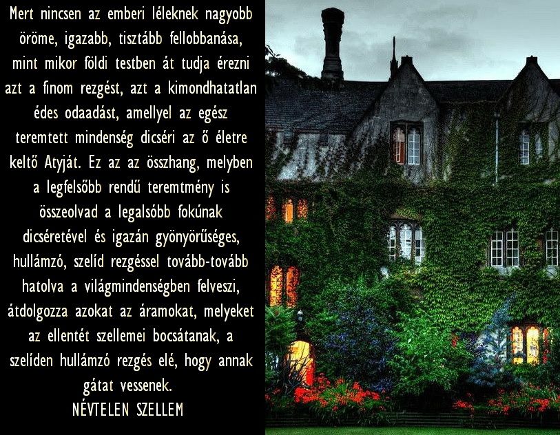 Mert nincsen az emberi léleknek nagyobb öröme, igazabb, tisztább fellobbanása, mint mikor földi testben át tudja érezni azt a finom rezgést, azt a kimondhatatlan édes odaadást, amellyel az egész teremtett mindenség dicséri az ő életre keltő Atyját. Ez az az összhang, melyben a legfelsőbb rendű teremtmény is összeolvad a legalsóbb fokúnak dicséretével és igazán gyönyörűséges, hullámzó, szelíd rezgéssel tovább-tovább hatolva a világmindenségben felveszi, átdolgozza azokat az áramokat, melyeket az ellentét szellemei bocsátanak, a szelíden hullámzó rezgés elé, hogy annak gátat vessenek.