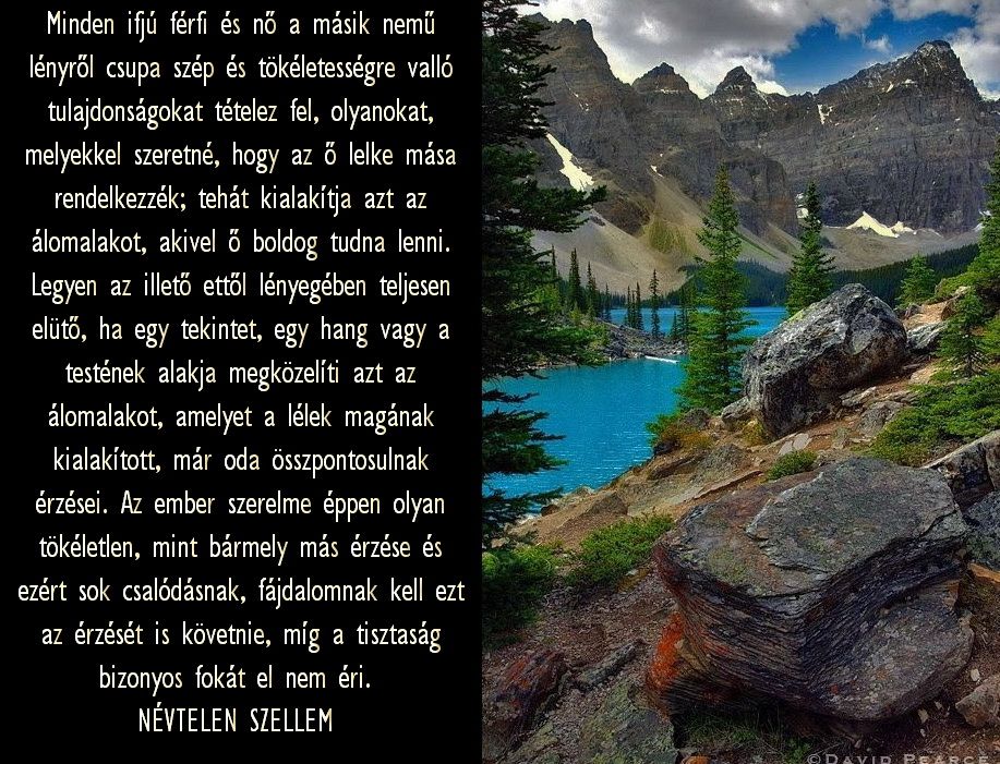 „Minden ifjú férfi és nő a másik nemű lényről csupa szép és tökéletességre valló tulajdonságokat tételez fel, olyanokat, melyekkel szeretné, hogy az ő lelke mása rendelkezzék; tehát kialakítja azt az álomalakot, akivel ő boldog tudna lenni. Legyen az illető ettől lényegében teljesen elütő, ha egy tekintet, egy hang vagy a testének alakja megközelíti azt az álomalakot, amelyet a lélek magának kialakított, már oda összpontosulnak érzései. Az ember szerelme éppen olyan tökéletlen, mint bármely más érzése, és ezért sok csalódásnak, fájdalomnak kell ezt az érzését is követnie, míg a tisztaság bizonyos fokát el nem éri.”