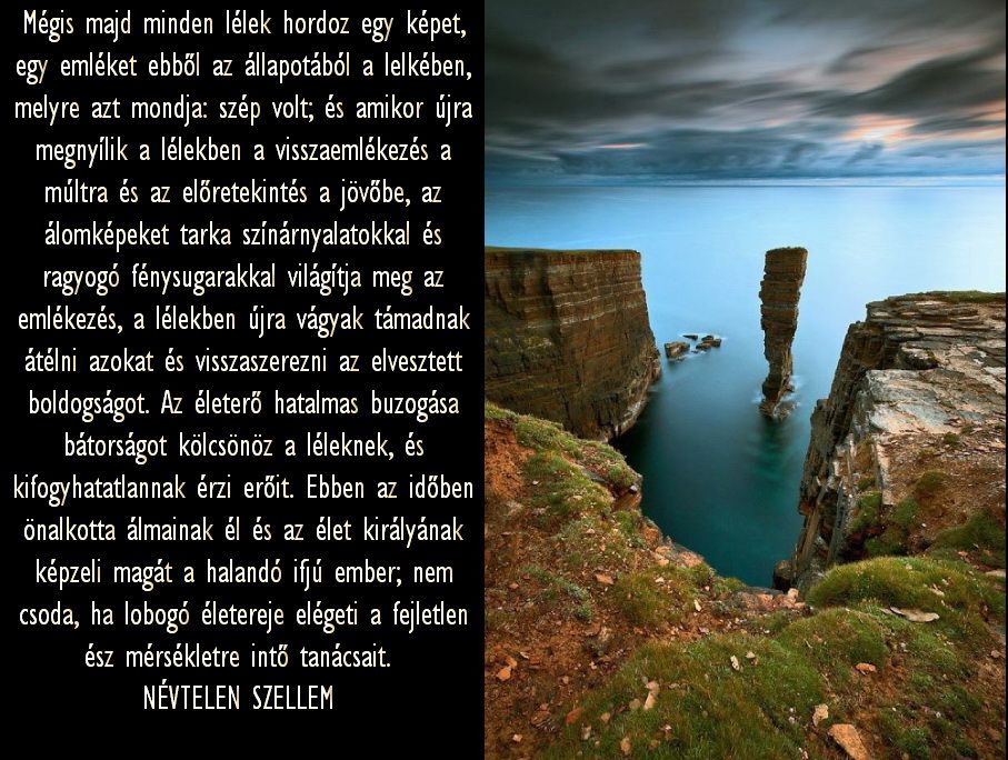 „Mégis majd minden lélek hordoz egy képet, egy emléket ebből az állapotából a lelkében, melyre azt mondja: szép volt; és amikor újra megnyílik a lélekben a visszaemlékezés a múltra és az előre tekintés a jövőbe, az álomképeket tarka színárnyalatokkal és ragyogó fénysugarakkal világítja meg az emlékezés, a lélekben újra vágyak támadnak átélni azokat és visszaszerezni az elvesztett 198 boldogságot. Az életerő hatalmas buzgása bátorságot kölcsönöz a léleknek, és kifogyhatatlannak érzi erőit. Ebben az időben önalkotta álmainak él, és az élet királyának képzeli magát a halandó ifjú ember; nem csoda, ha lobogó életereje elégeti a fejletlen ész mérsékletre intő tanácsait.”